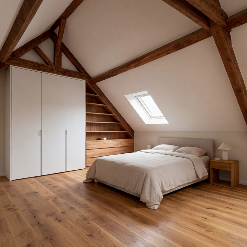 Pared irregular, techo alto y necesidad de más almacenaje sin recargar la habitación.