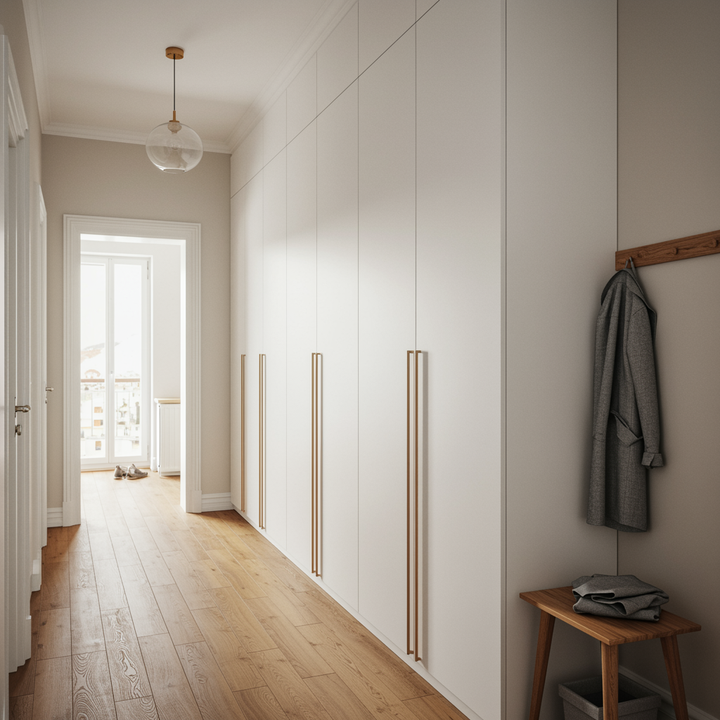 Diseñamos un armario a medida que se integra en el pasillo y aprovecha cada centímetro sin invadir la circulación.