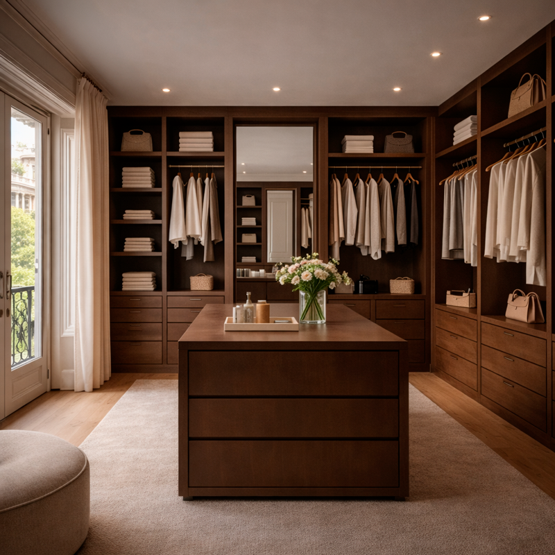 No se trata de tener más, sino de ver mejor. Un vestidor bien diseñado permite leer el conjunto de un vistazo y elegir con calma, sin ruido visual ni sensación de saturación.